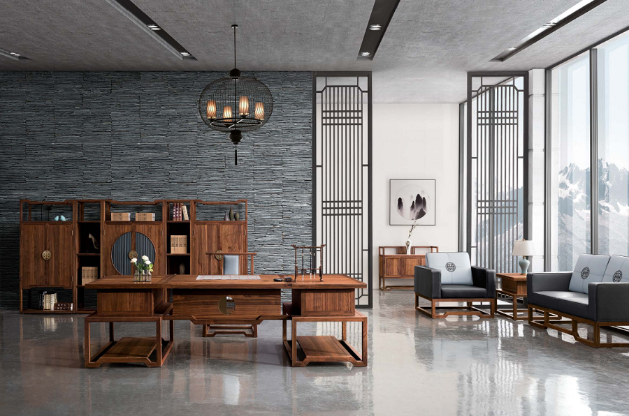 中式風(fēng)格:新中式東方美學(xué),刪繁就簡(jiǎn)、古色古香,班臺(tái)、壁柜、茶臺(tái)、接待區(qū)