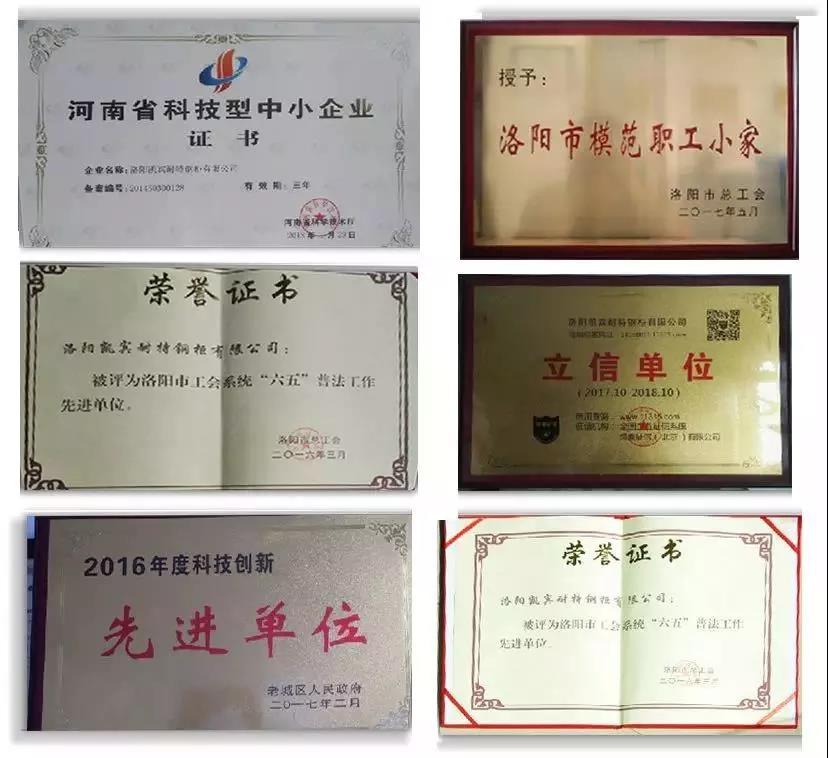 2014年取得ISO9001質(zhì)量管理體系、ISO14001環(huán)境管理體系 、OHSAS18001職業(yè)健康安全管理體系三大管理體系認(rèn)證,同年獲得河南省科技廳頒發(fā)的“科技型中小企業(yè)”,市科技局頒發(fā)的“市級(jí)企業(yè)研發(fā)中心”;2015年市工信委頒發(fā)“隱形企業(yè)”、“民營企業(yè)”,市科技局頒發(fā)“科技小巨人培育企業(yè)”,市總工會(huì)頒發(fā)“五一勞動(dòng)獎(jiǎng)狀”、“和諧勞動(dòng)關(guān)系模范單位”;2016年洛陽市總工會(huì)頒發(fā)“六五普法工作先進(jìn)單位”;2017年老城區(qū)政府頒發(fā)“科技創(chuàng)新先進(jìn)單位”,洛陽市總工會(huì)頒發(fā)“模范職工小家”,同年通過綠盾企業(yè)征信系統(tǒng)認(rèn)證,中國環(huán)境標(biāo)志產(chǎn)品認(rèn)證;2019年獲得兩化融合管理體系評定證書,以及近年來共獲得外觀設(shè)計(jì)和實(shí)用新型33項(xiàng)。